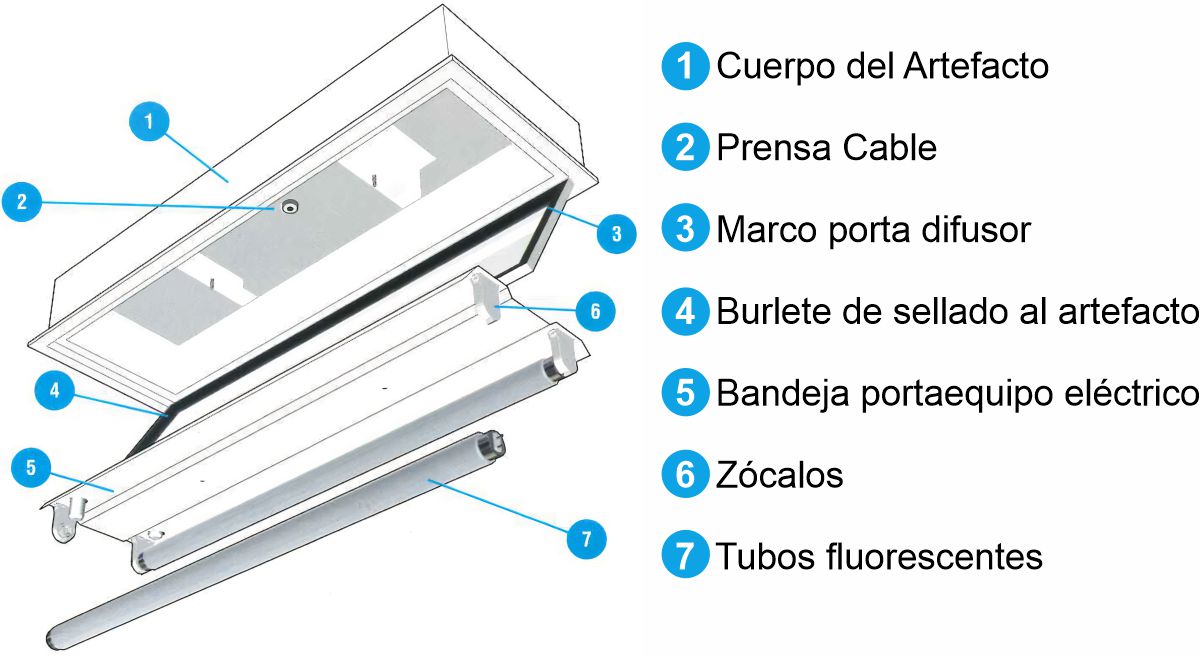 Lámparas herméticas E15 E57 son artefactos de embutir adaptable a la mayor parte de los techos o aperturas (durlock, yeso o similar) de doble hermeticidad, para tubos fluorescentes de 0 26mm o 0 16mm (T5)